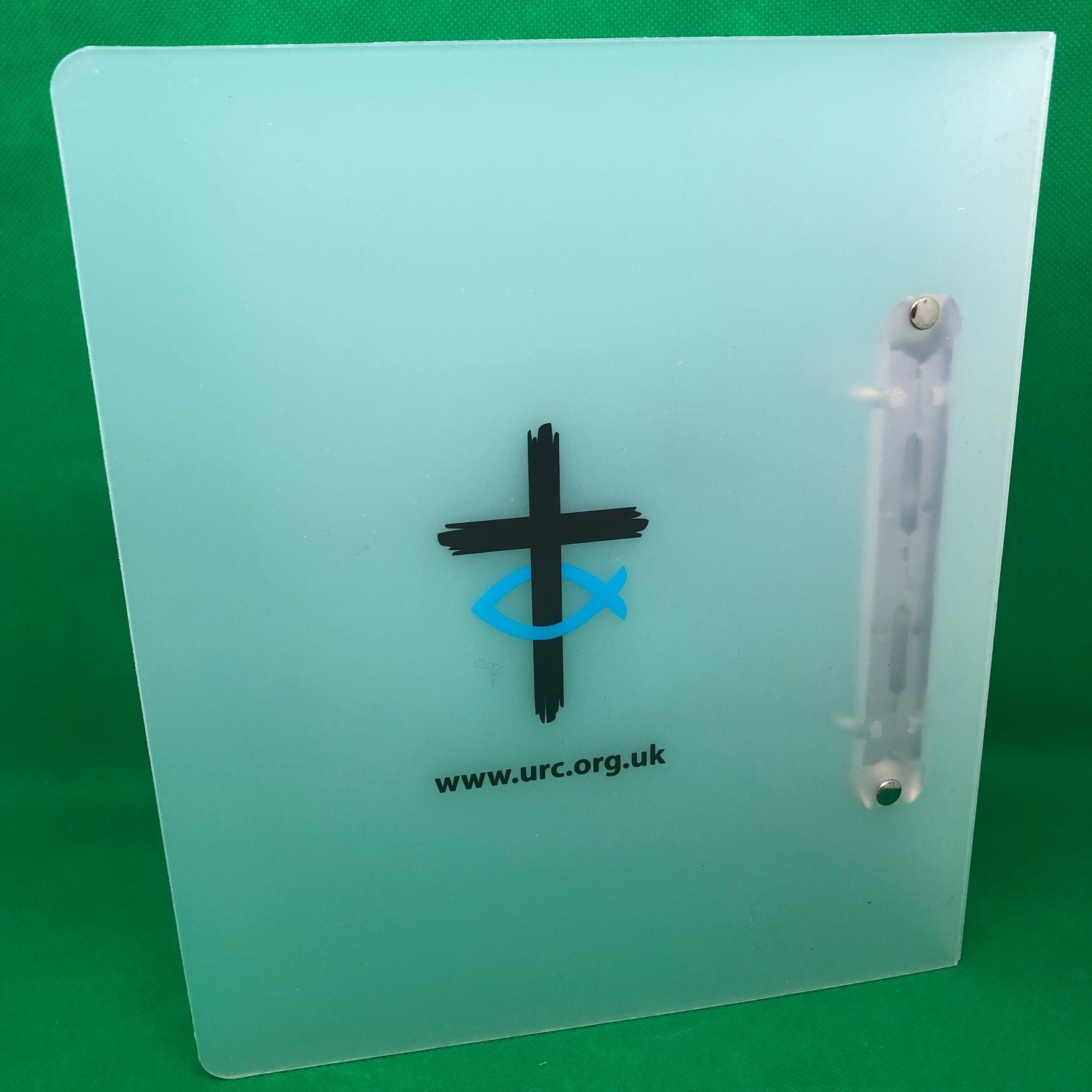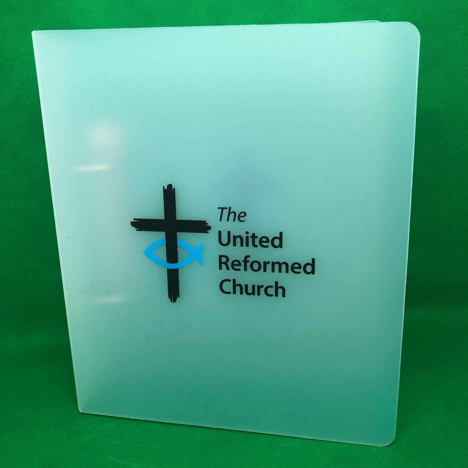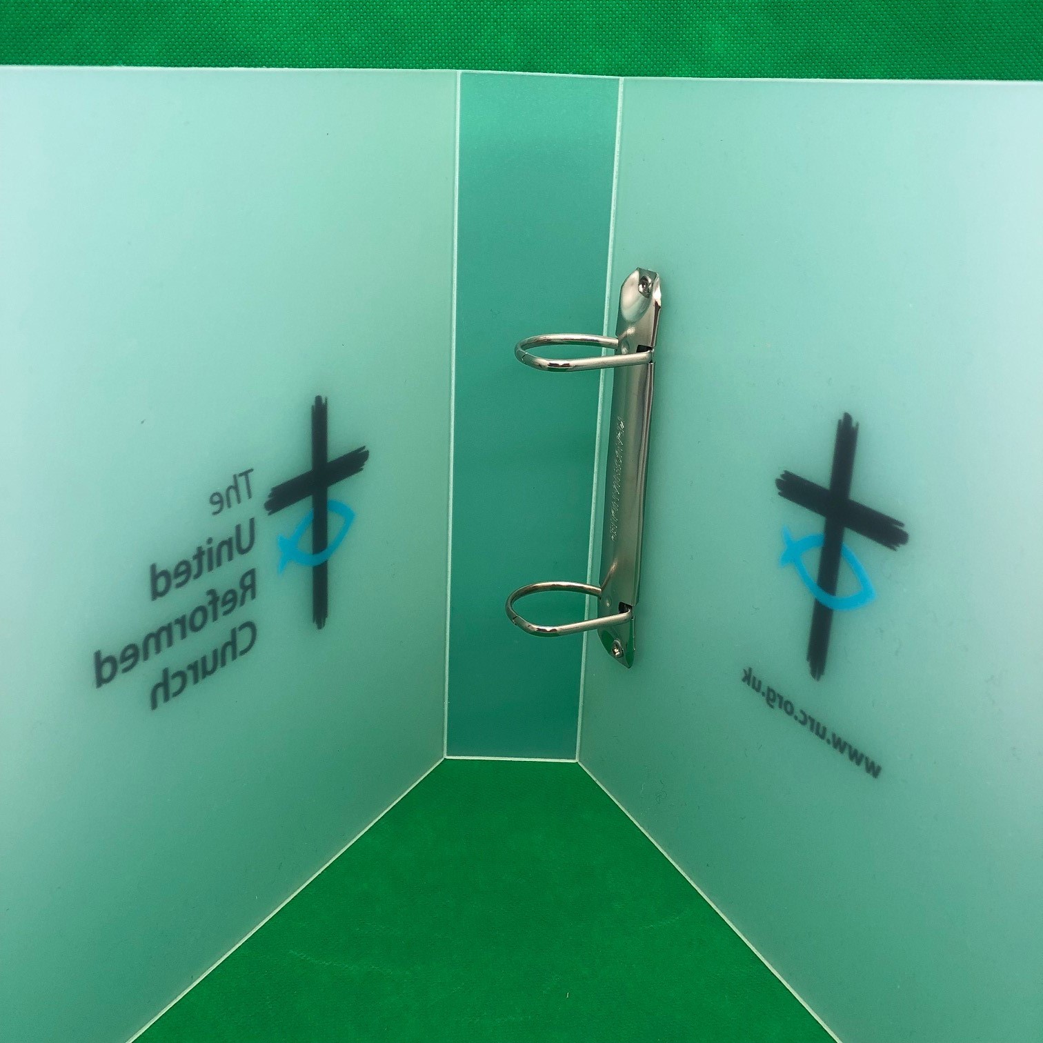 An A5 ring binder to replace those provided with Worship Parts 1 & 2, or to use for other purposes, such as for service and sermon notes. A hard-wearing, thick, opaque plastic folder with the URC logo on the front and back covers, with a 2-ring binder mechanism for A5 sheets.