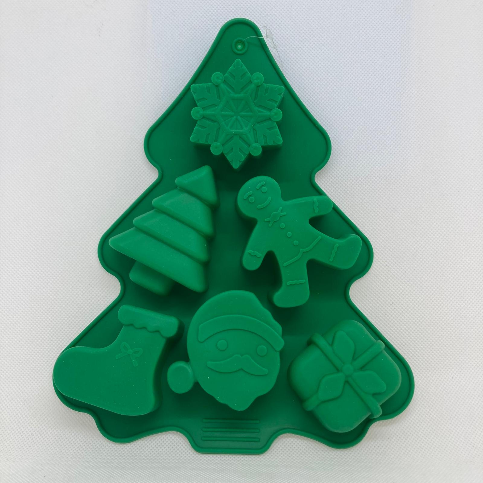 A silicone mould from Flying Tiger Copenhagen in a Christmas tree shape with a snowflake, tree, gingerbread person, stocking, present and Father Christmas shapes.
