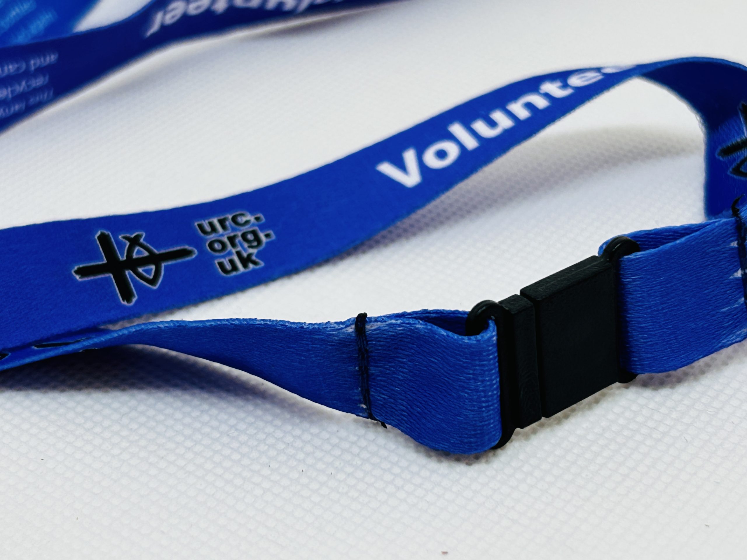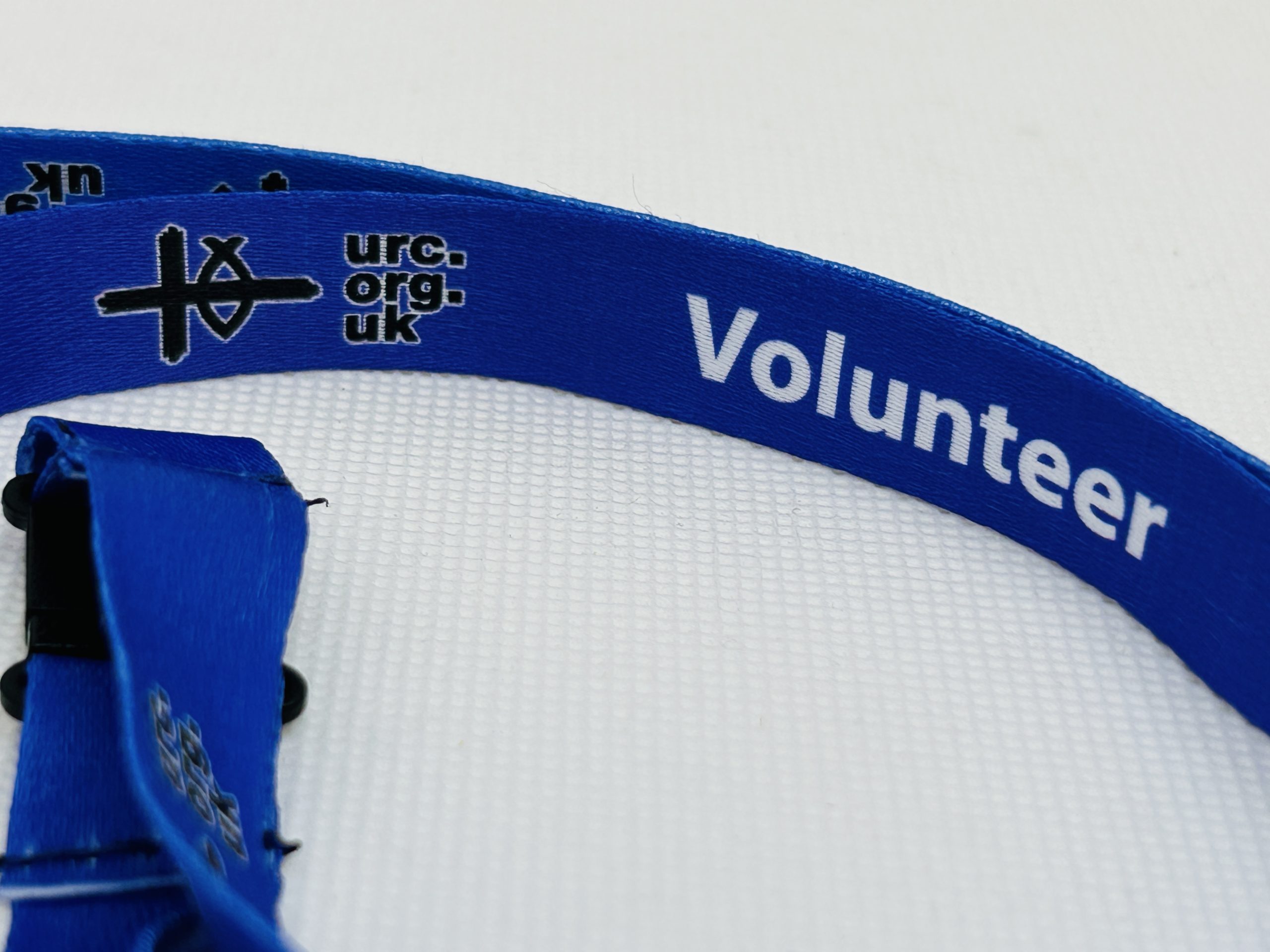 A URC logo lanyard made from RPET, a material made from recycled plastic water bottles which can be recycled again, with the URC logo, website address and the word Volunteer on it. Ideal for those in churches or community groups wanting to show that they are a volunteer. Used at the 2025 Greenbelt Festival.