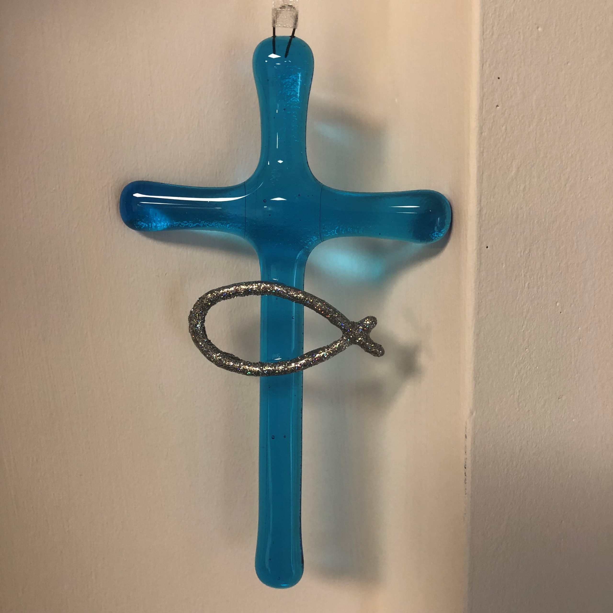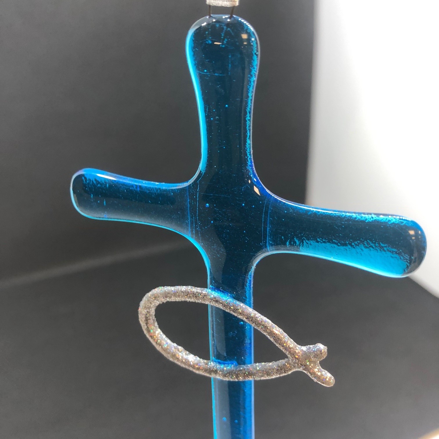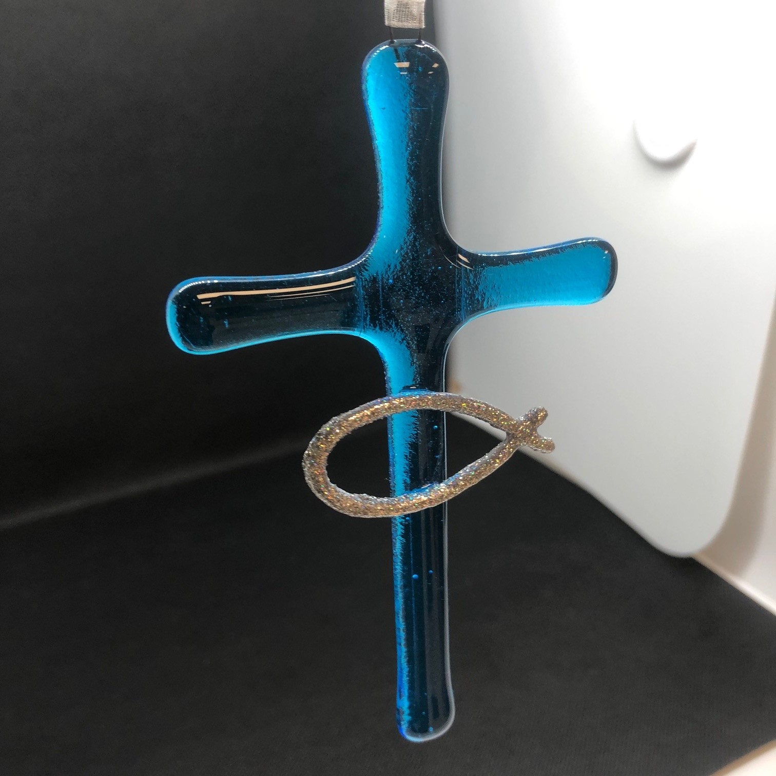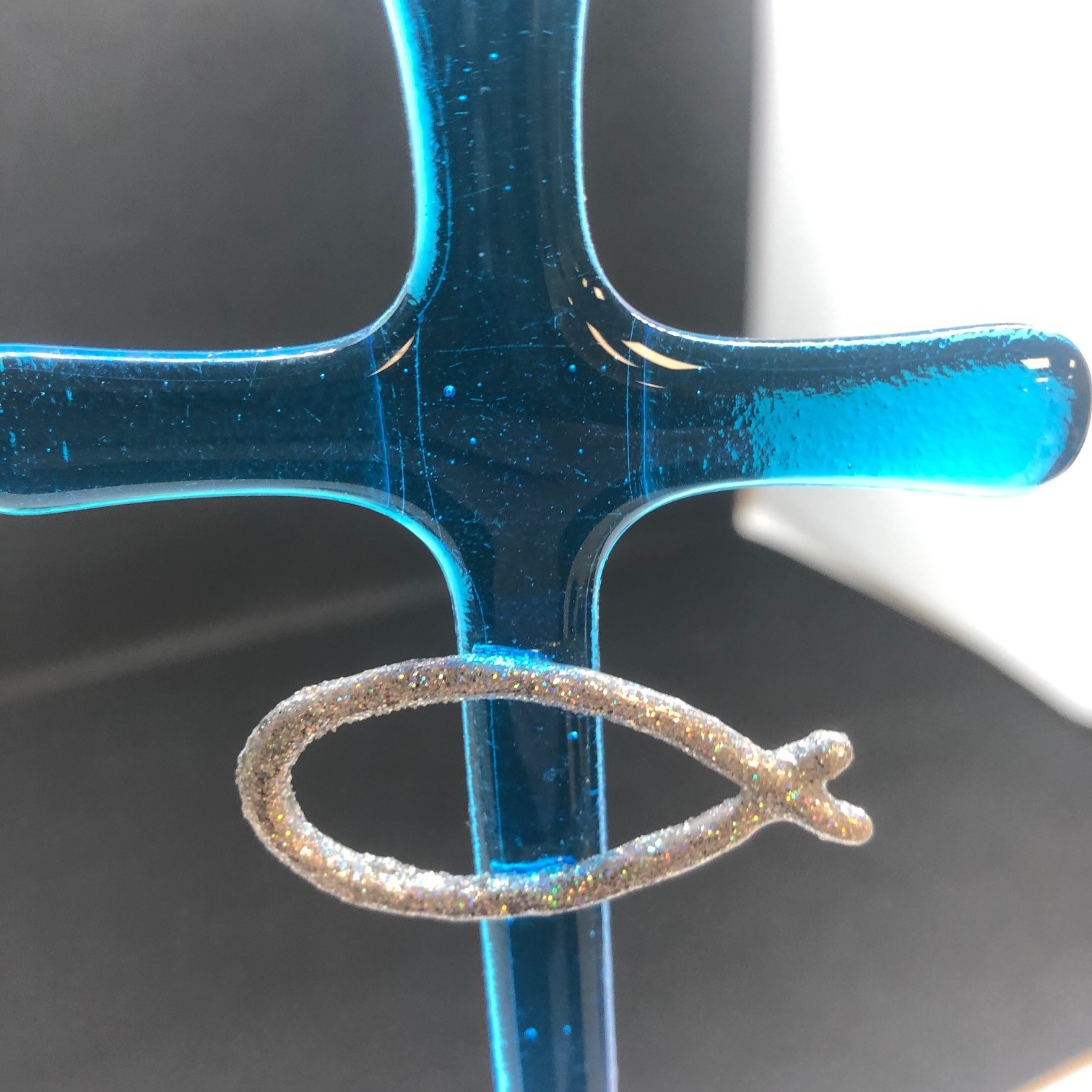 Each cross has a silver fish fused to the vertical part of the cross and each has a metal hanging loop embedded into the top of the glass with some ribbon to hang it.