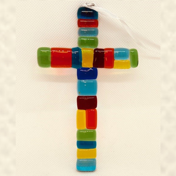 The gorgeous new 12cm by 7.5cm glass cross by renowned Hastings-based artist Isabel Sargent, whose work is sold by the National Trust, is made up of different coloured glass rectangles and squares fused together to form a cross in the kiln.