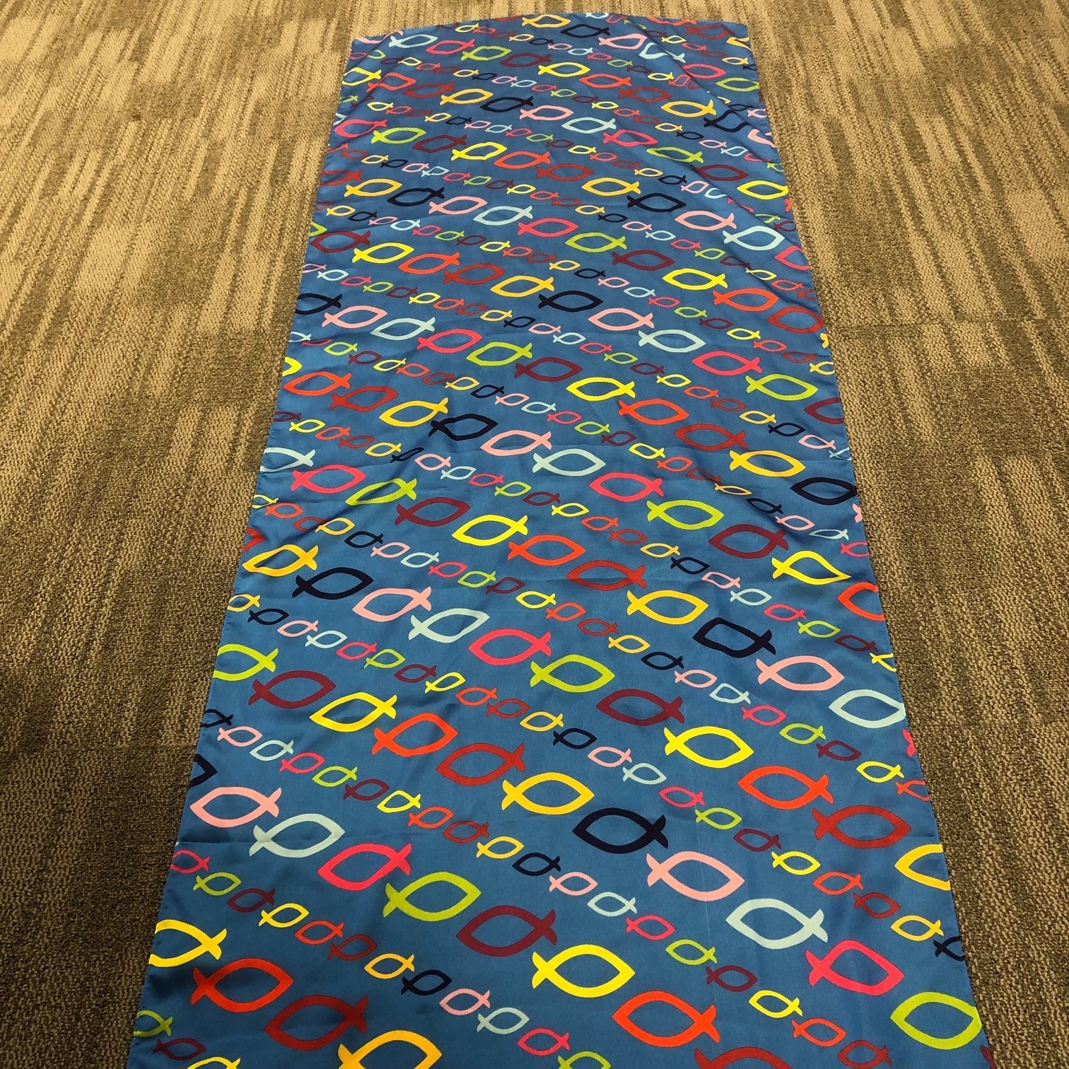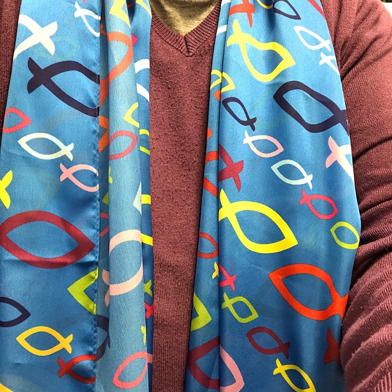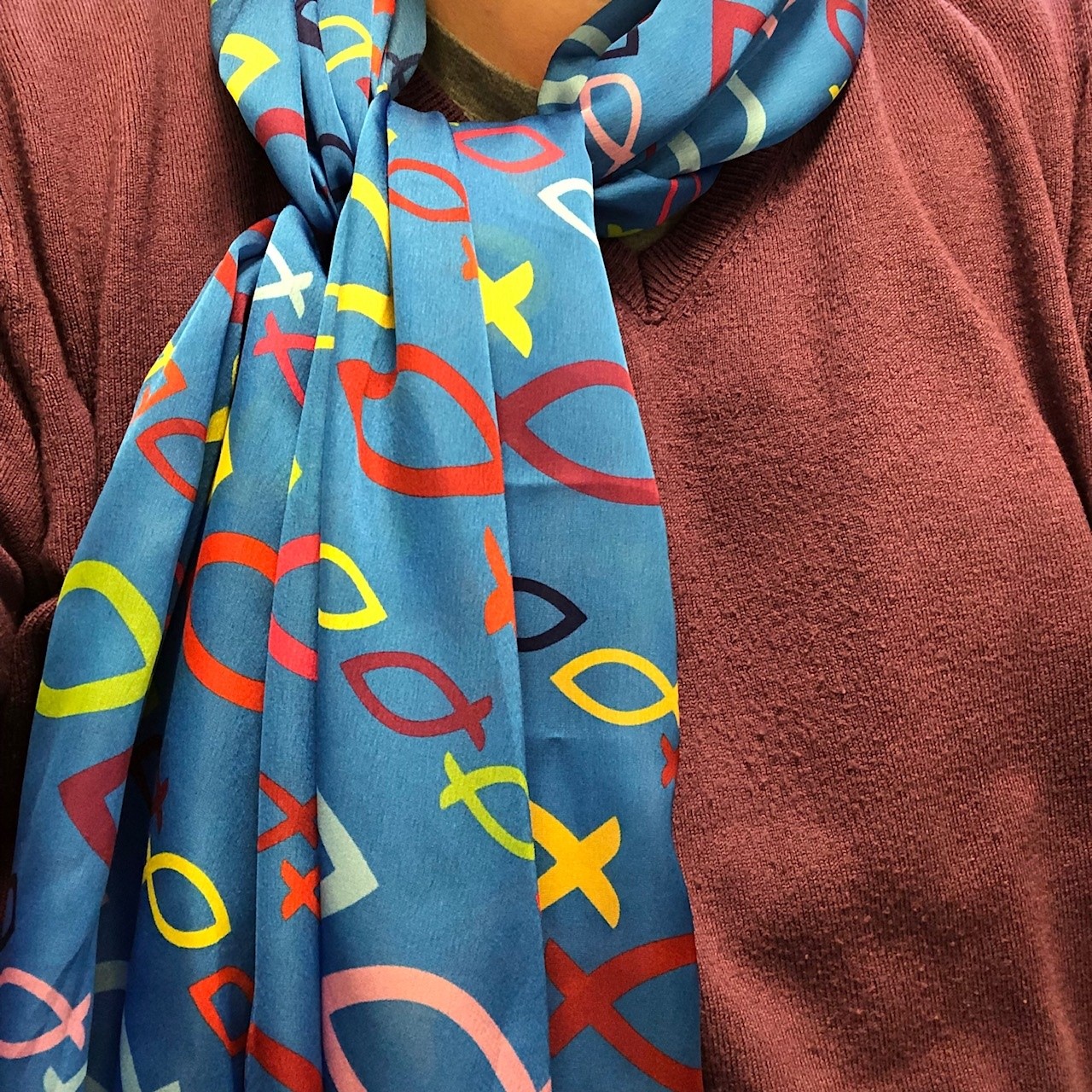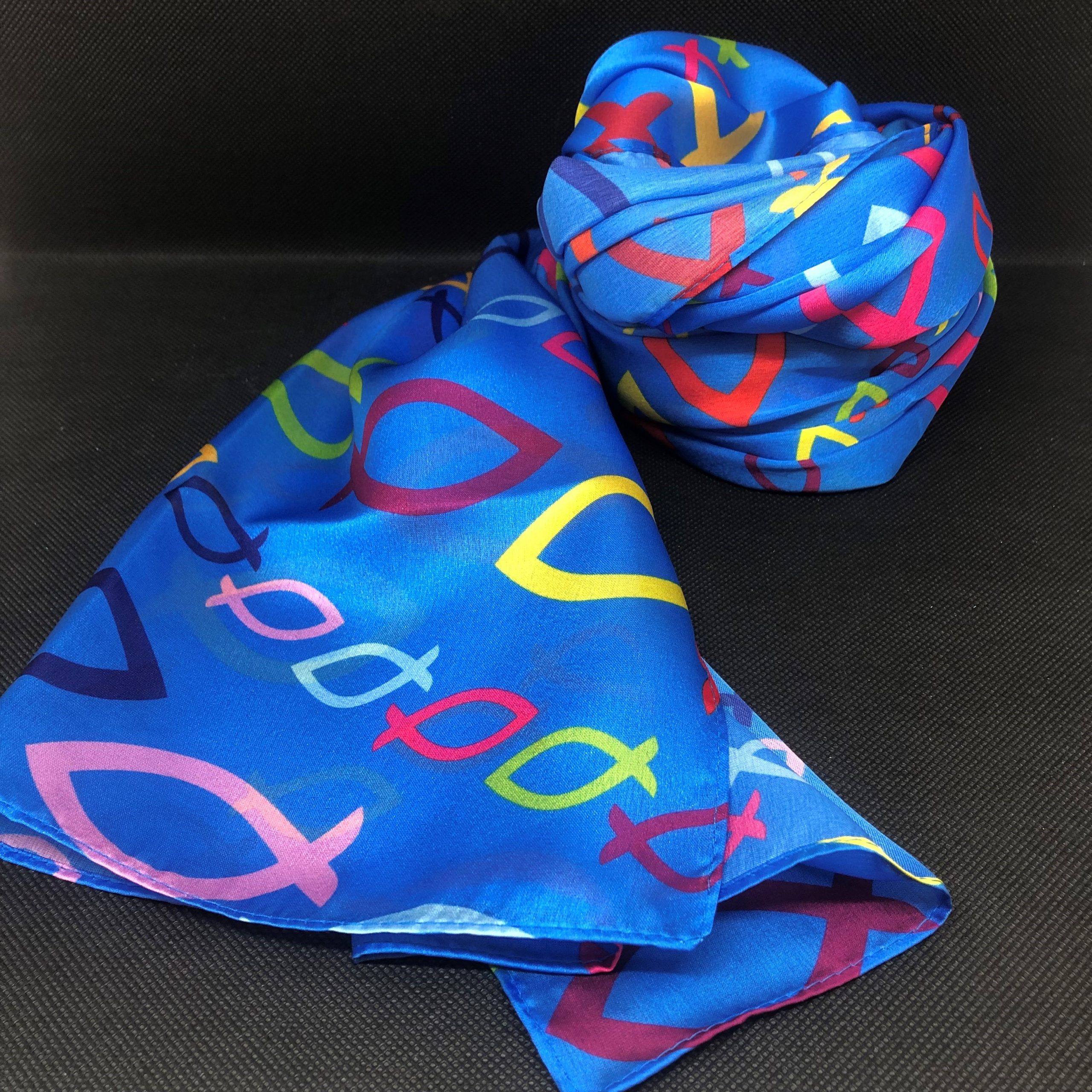 Back in stock by popular demand, a lightweight polyester scarf measuring 2m x 80cm in the URC’s blue and multi-coloured fish design.