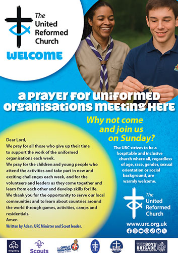 A free poster for you to place in rooms used by uniformed groups, such as Scouts, Guides, Boys’ Brigade, Girls’ Brigade or Pilots, aimed at connecting the members and parents of those groups with the church with a dedicated prayer and an invitation to Sunday worship.