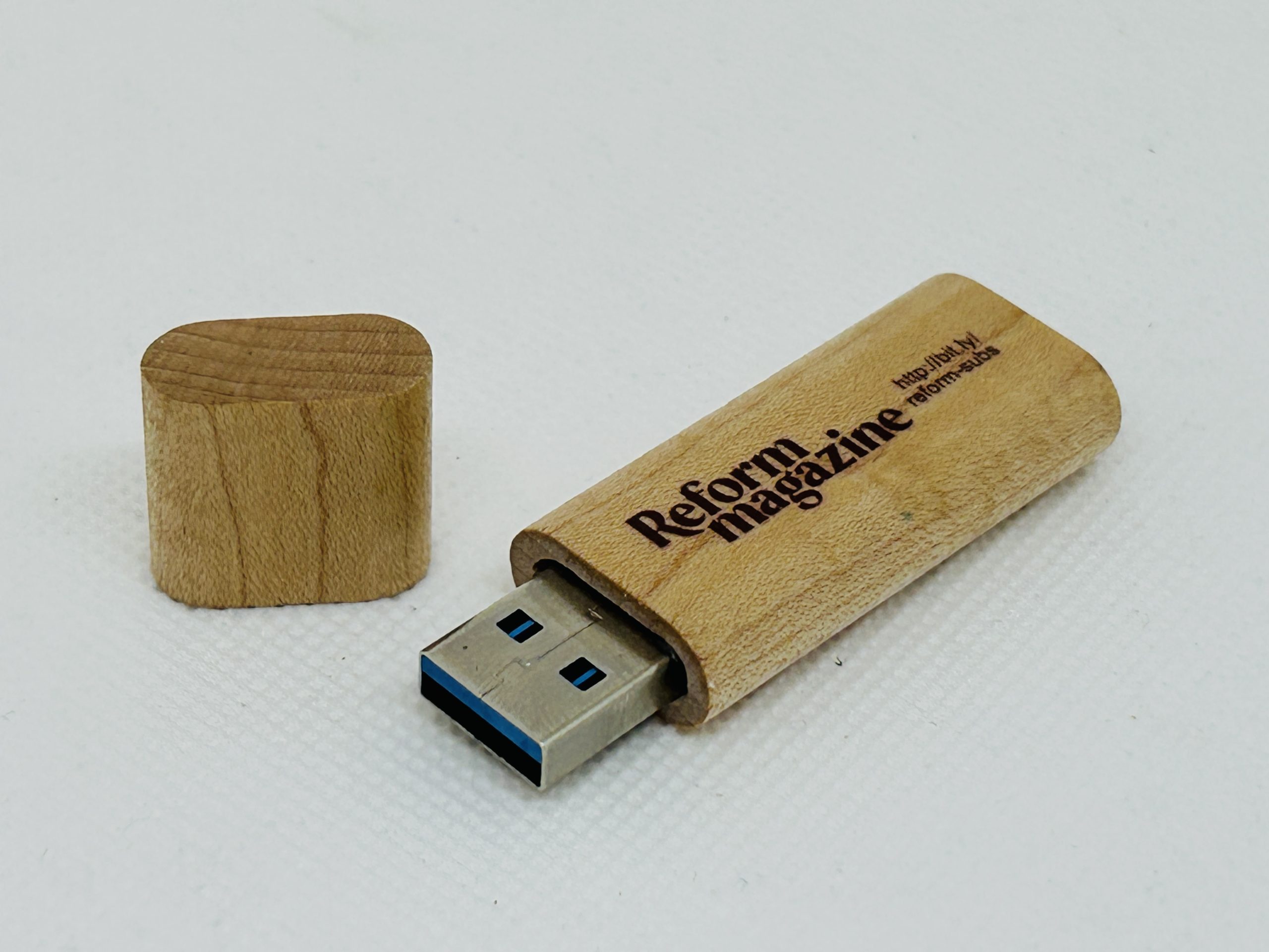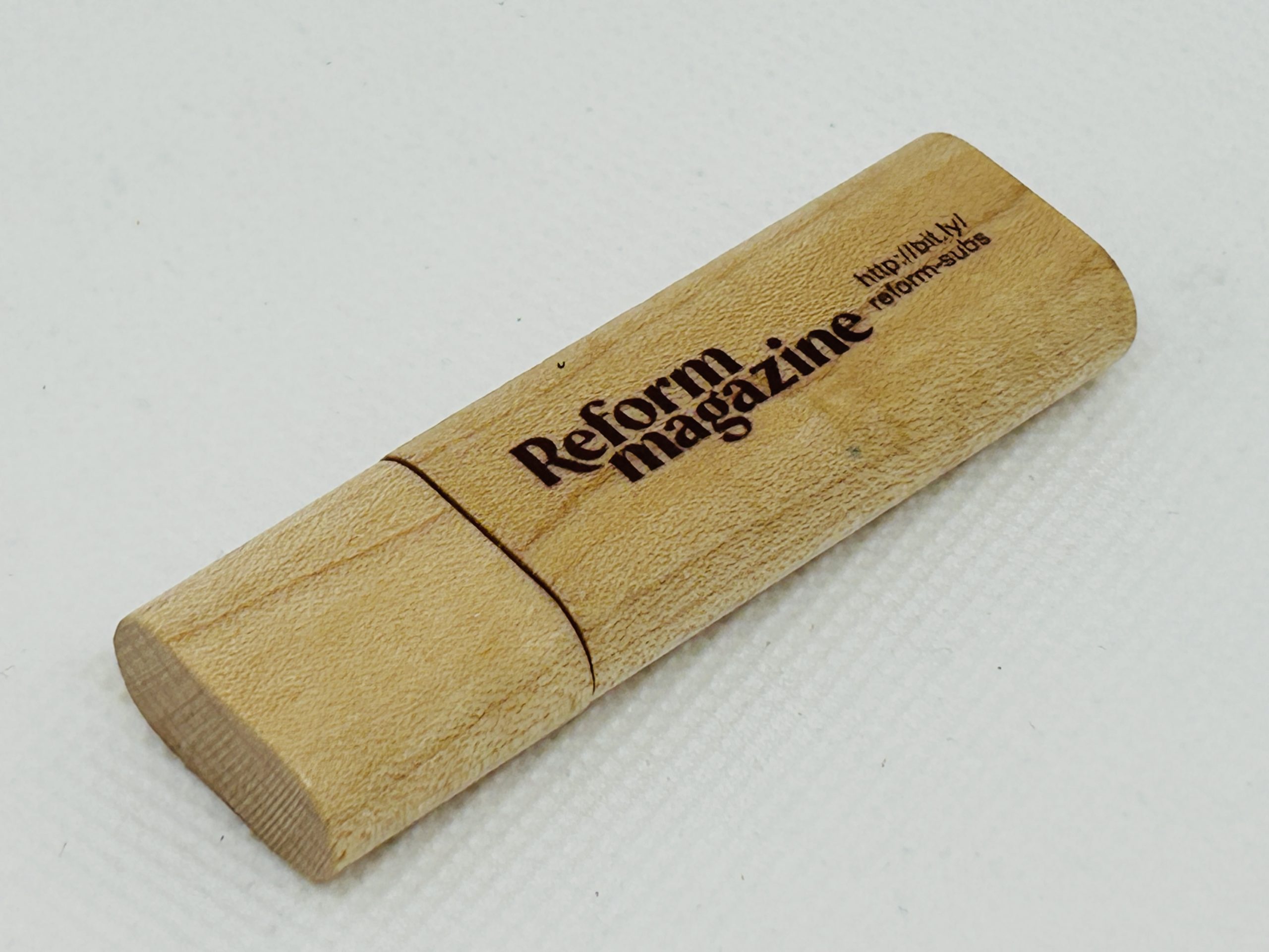 A USB stick made from eco-friendly wood with a magnetic lid. The URC logo and web address on one side, and the Reform magazine logo on the other. Printed and varnished. 32Gb capacity with red indicator light which illuminates when plugged in.