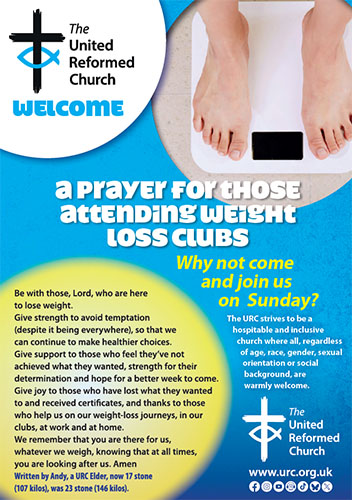 A free poster for you to place in rooms used by weight-loss groups, such as Weight Watchers or Slimming World, aimed at connecting the members of those groups with the church with a prayer and an invitation to Sunday worship.