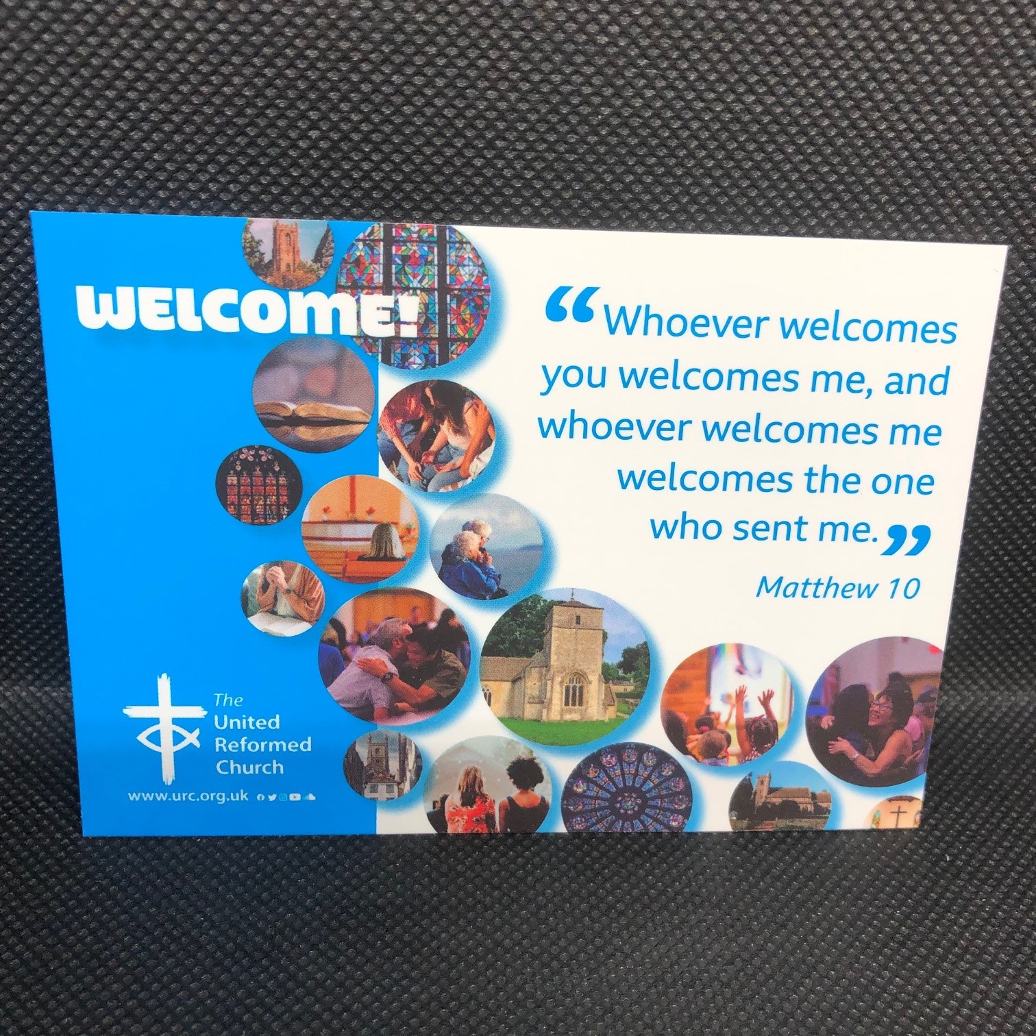 The front of the card has a welcome message and a passage about welcome from Matthew 10.