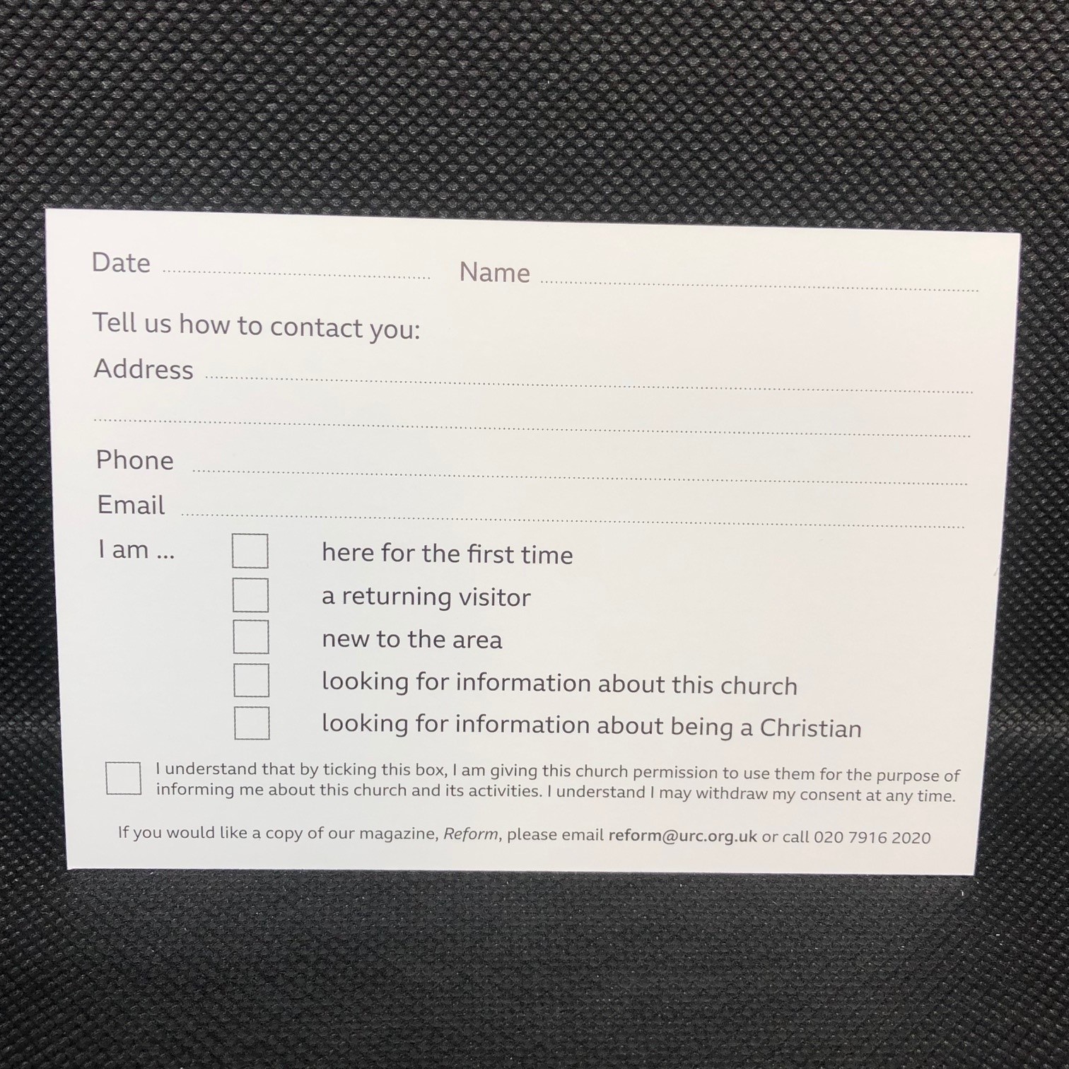 The rear of the card asks some basic questions, has room for contact information and permission to get in touch, as per GDPR regulations.